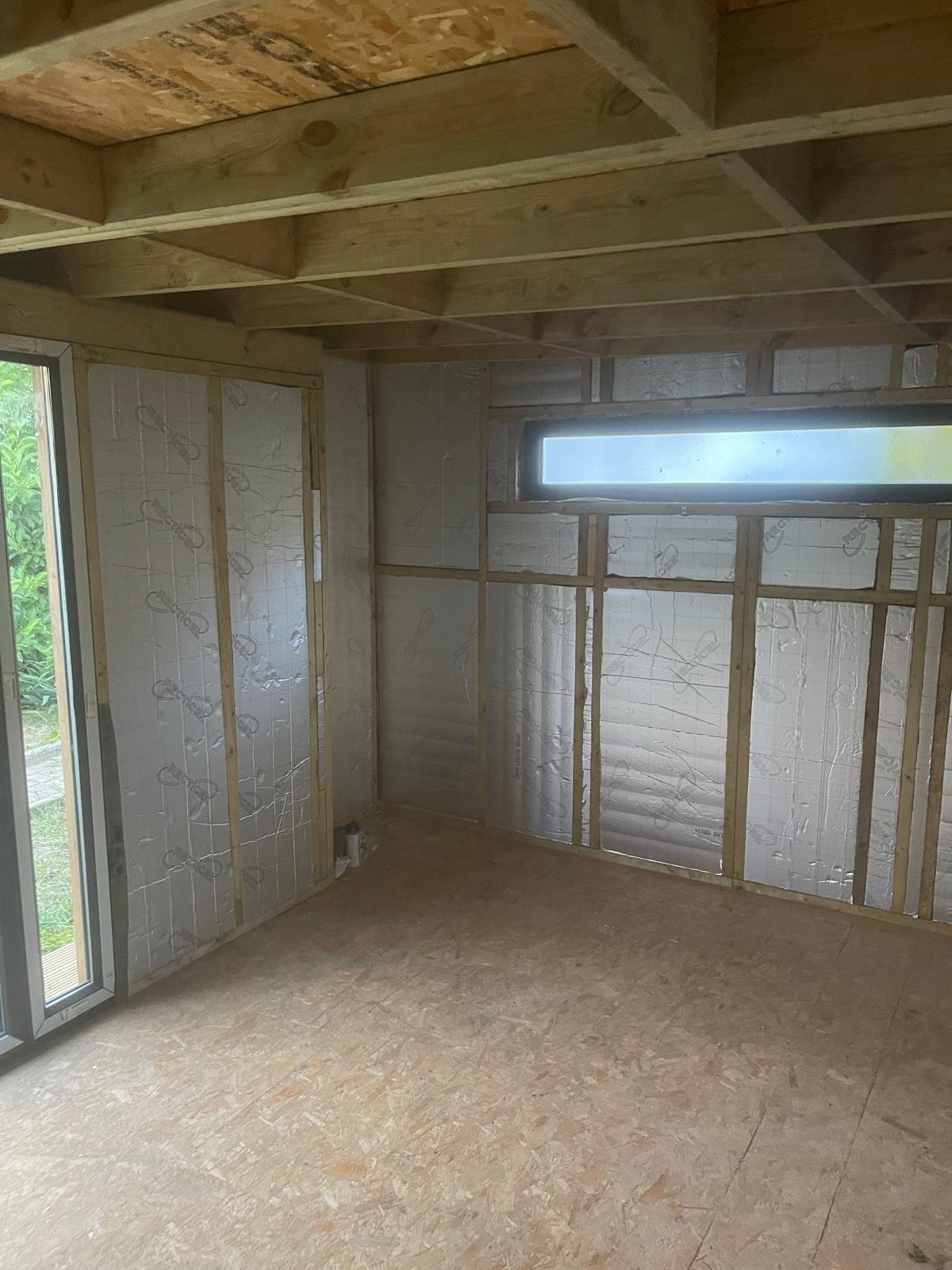 Timber framing and insulation create a solid, year-round space with clean interior lines.